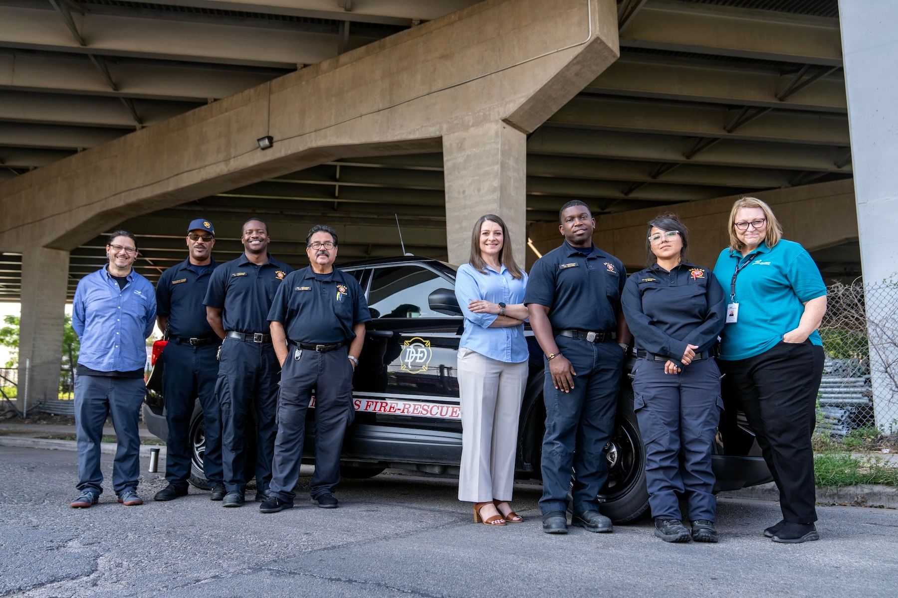 A joint team from the Recovery Resource Council and Dallas Fire-Rescue poses for a portrait outside a fire station in Deep Ellum. (Photo by Jeffrey McWhorter)