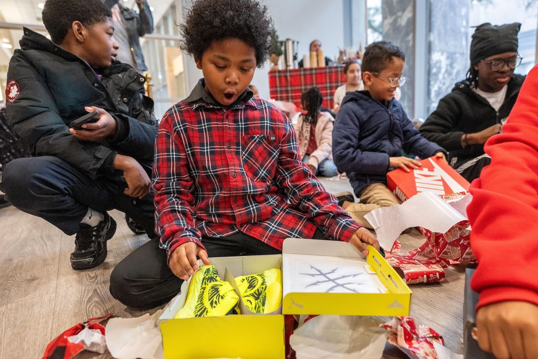Their adversity was drowned out that Saturday by Christmas cheer. Each child unwrapped a new pair of shoes, from sparkly gray Nikes to highlighter-yellow LaMelo Ball Pumas to red New Balances. The guardians took home gifts of their own: three-wick candles and a Bath and Body Works gift card.