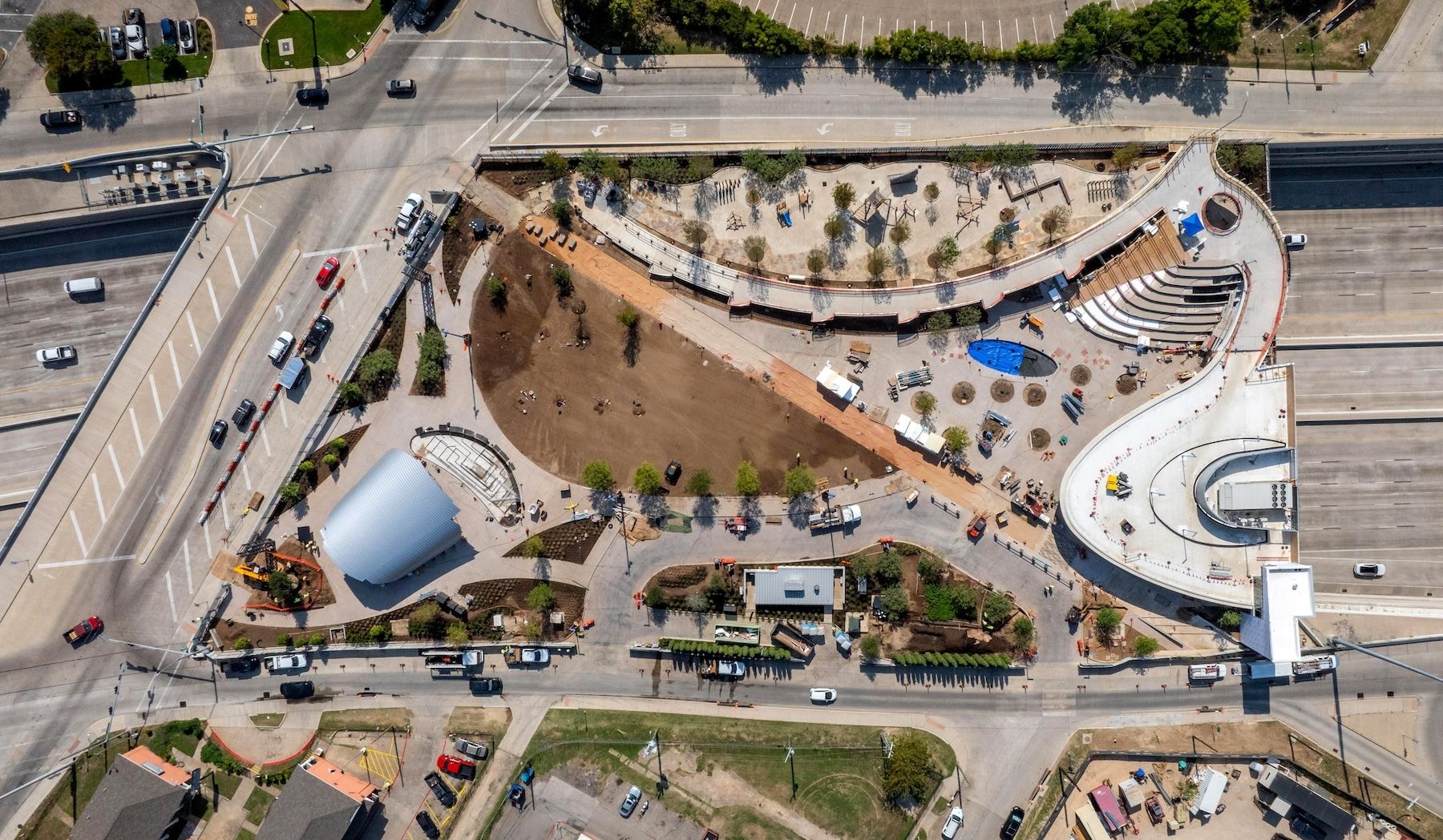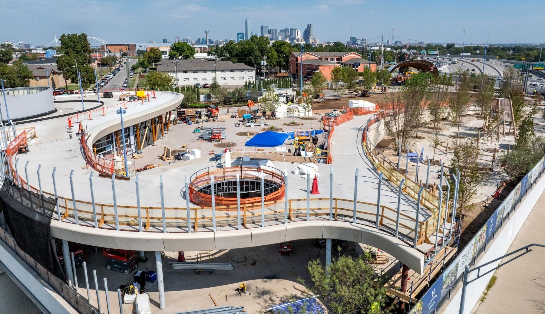 Construction workers move around Halperin Park, a new deck park being built over Interstate 35 in Oak Cliff. (Photo by Jeffrey McWhorter)