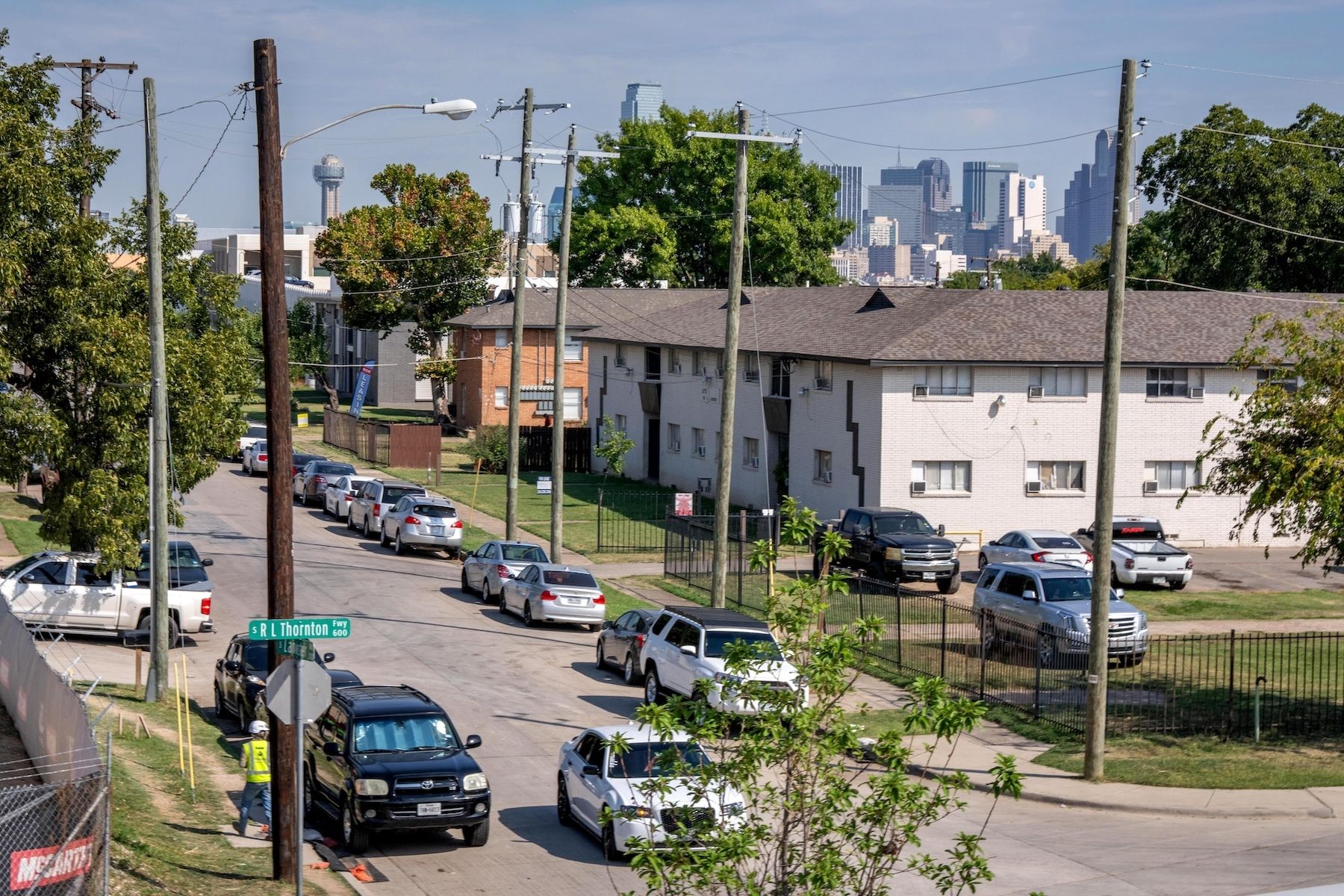 A construction worker walks north on Lancaster Avenue toward the neighborhood immediately on the west side of Halperin Park. (Photo by Jeffrey McWhorter)