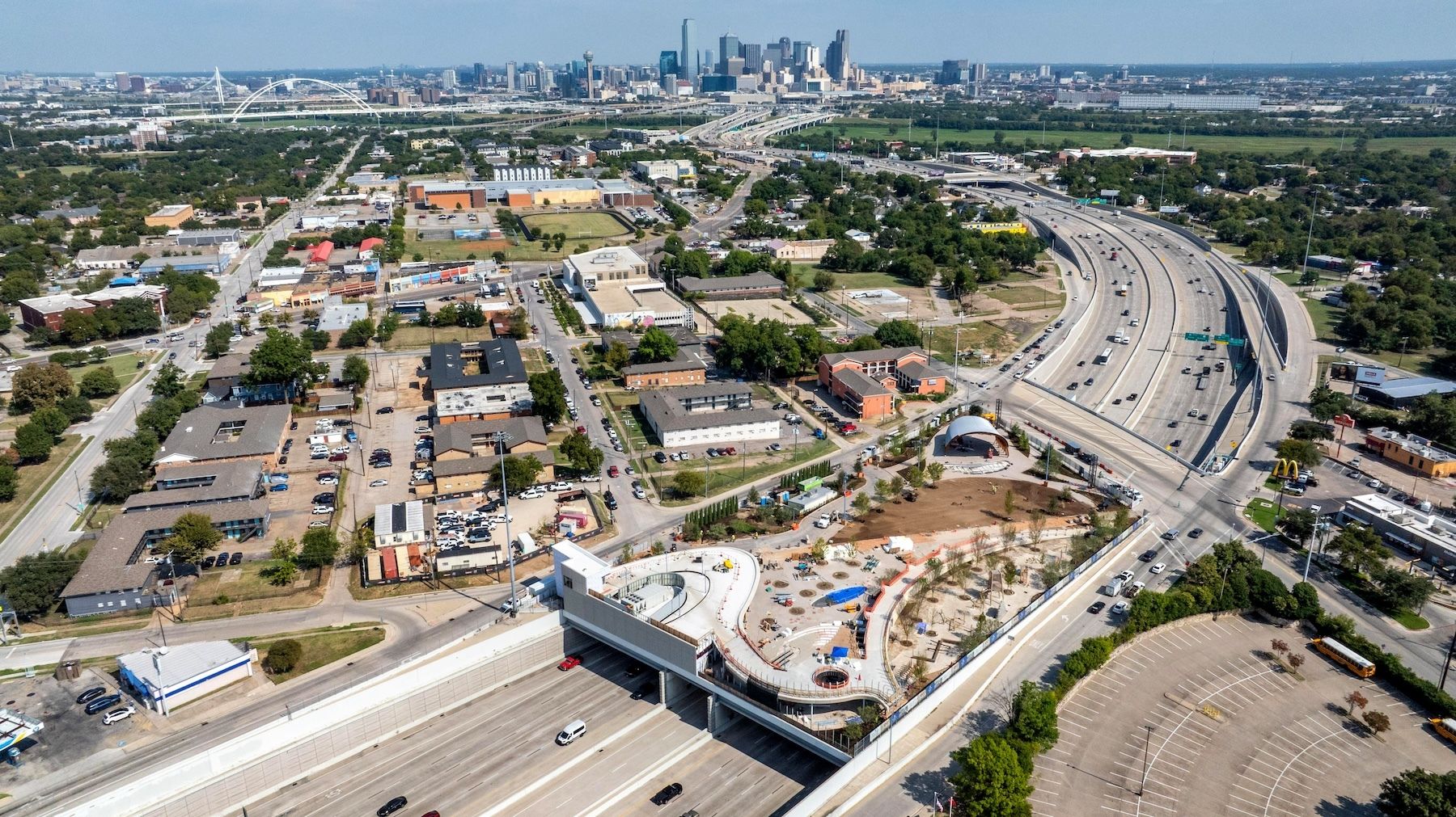 In this aerial view, downtown can be seen in the distance behind Halperin Park, a new deck park being built over Interstate 35E in Oak Cliff. (Photo by Jeffrey McWhorter)