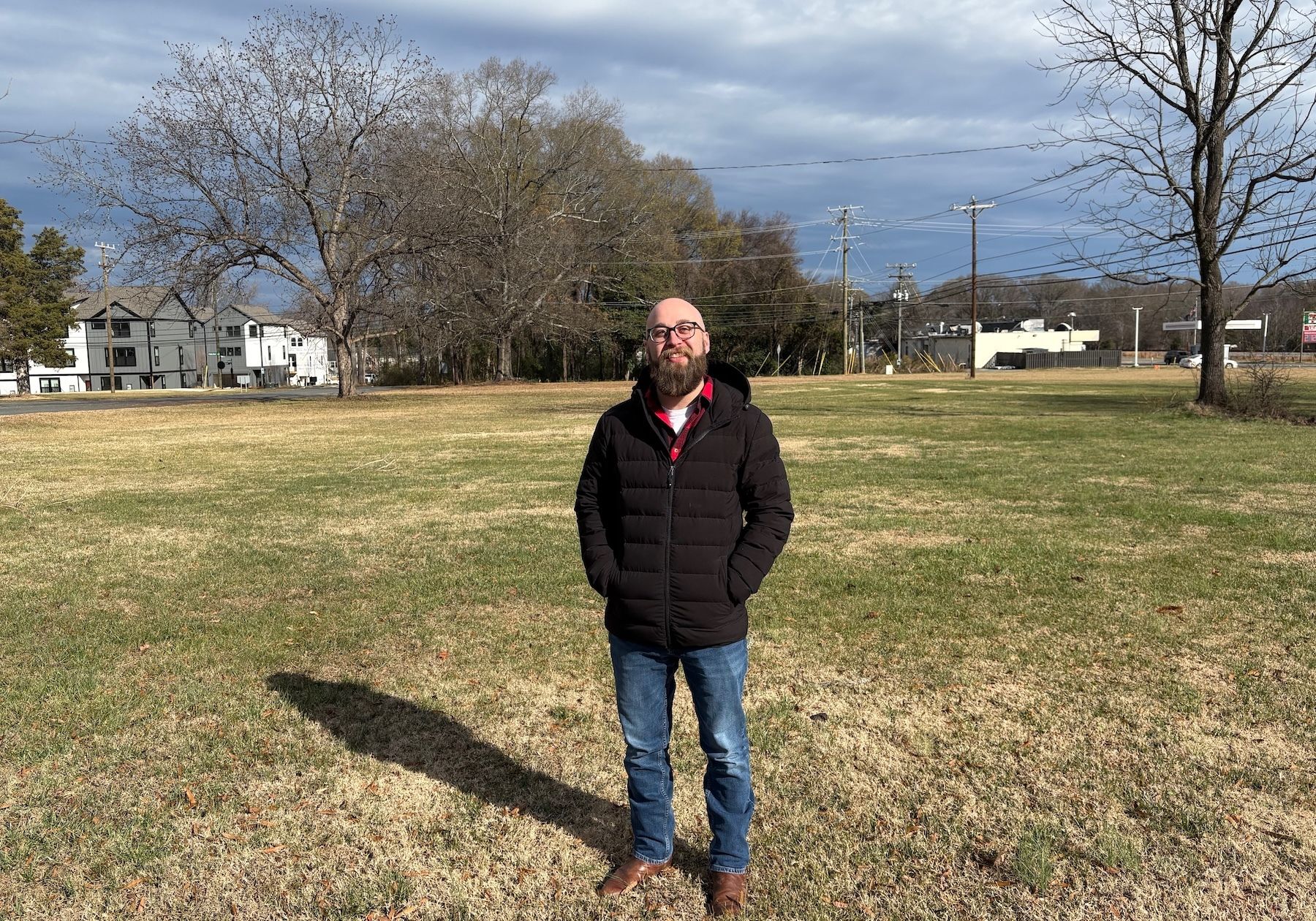 Pastor Matt Conner stands in the 4.5-acre field adjacent to Newell Presbyterian’s sanctuary, where more than 50 townhomes will be built this year. (Photo by Sharon Grigsby)