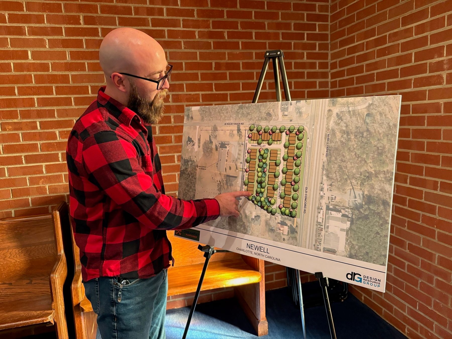 Pastor Matt Conner explains details of the Newell Station development with the help of a schematic the church keeps on display in its sanctuary. (Photo by Sharon Grigsby)